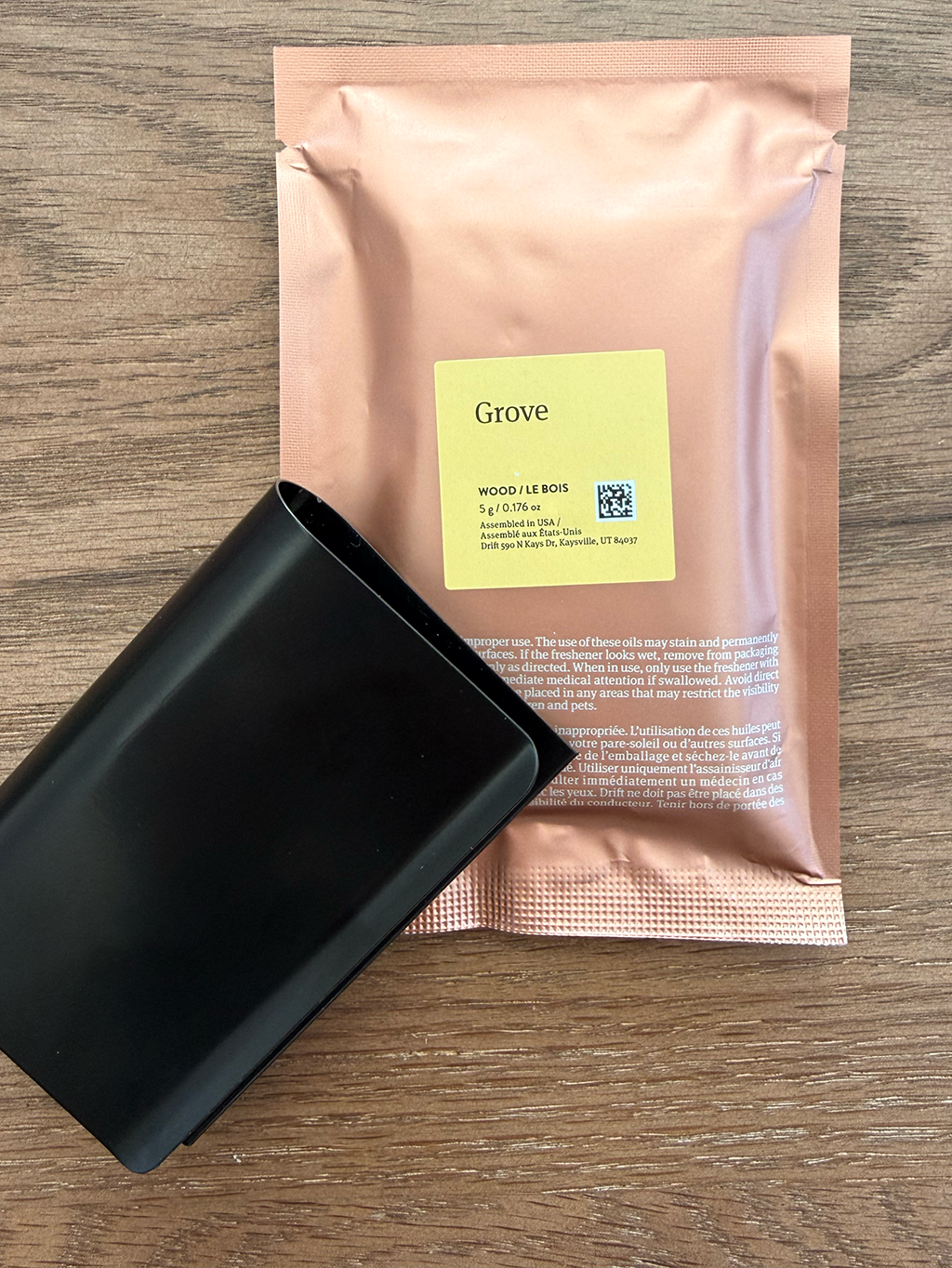 My friend Heather gave us all these Drift Car Fresheners. Which my brother had actually given me for Christmas too! I hadn’t heard of them before but they have wood & stone versions, both that are soaked in essential oils and magnetized to fit on your visor with the metal clip they come with.